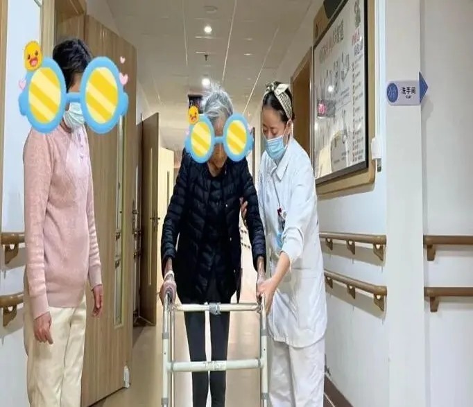 病房里传来温暖鼓励声,99岁的陈奶奶正稳稳握着助行器,在护士的贴心陪伴下一步步缓缓走出病房。