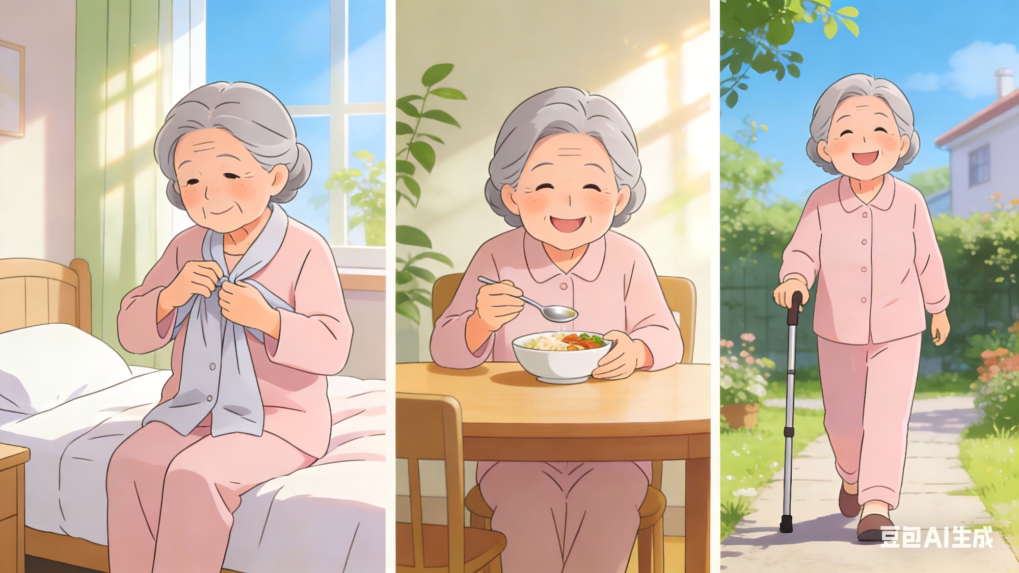 现在不光能自己穿衣服吃饭,还能出门溜达溜达,脸上笑容都回来啦!