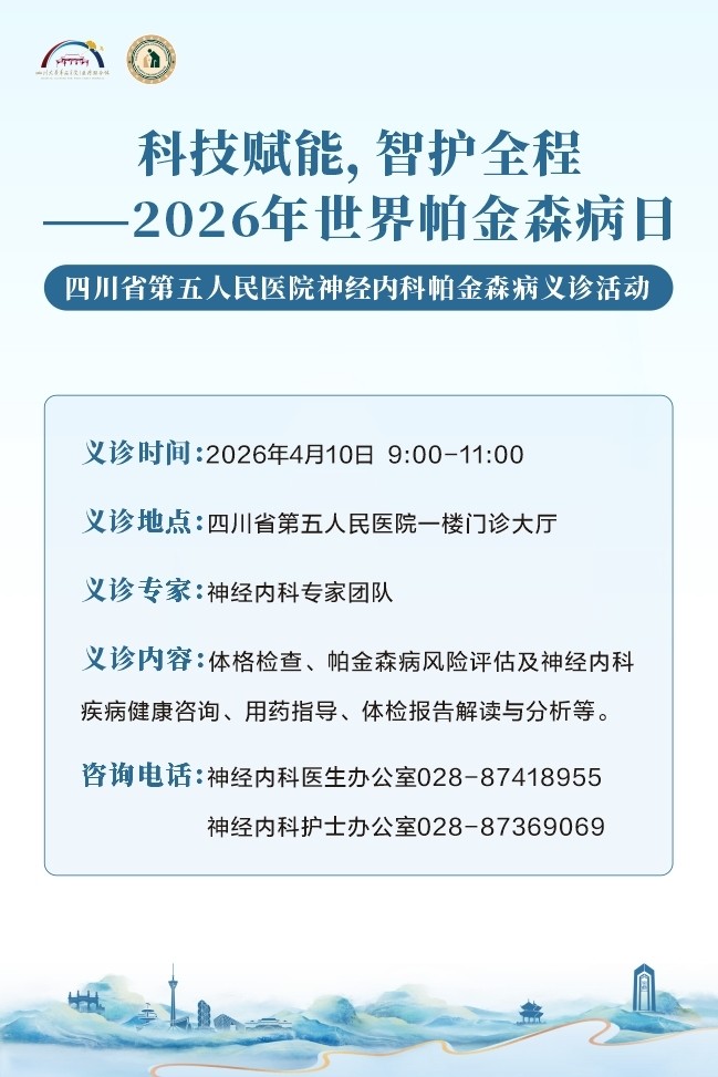 四川省第五人民医院神经内科将举办世界帕金森病日义诊活动,提高公众对帕金森病的正确认识,促进疾病早诊断、早治疗、早干预,提高患者的生活质量,用专业与温暖,守护每一位“帕友”的健康。