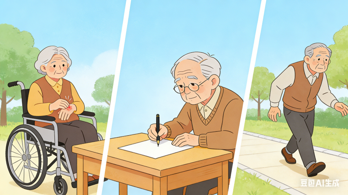 2.肌强直(僵):肢体僵硬、发沉,活动时感觉费力,比如起床、转身困难,面部肌肉僵硬导致“面具脸”(表情减少);