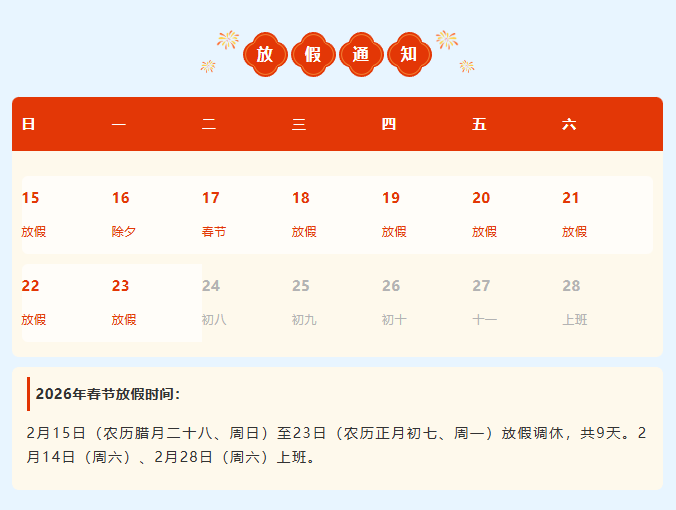 2月15日(周日)至2月23日(周一)放假调休,共9天。