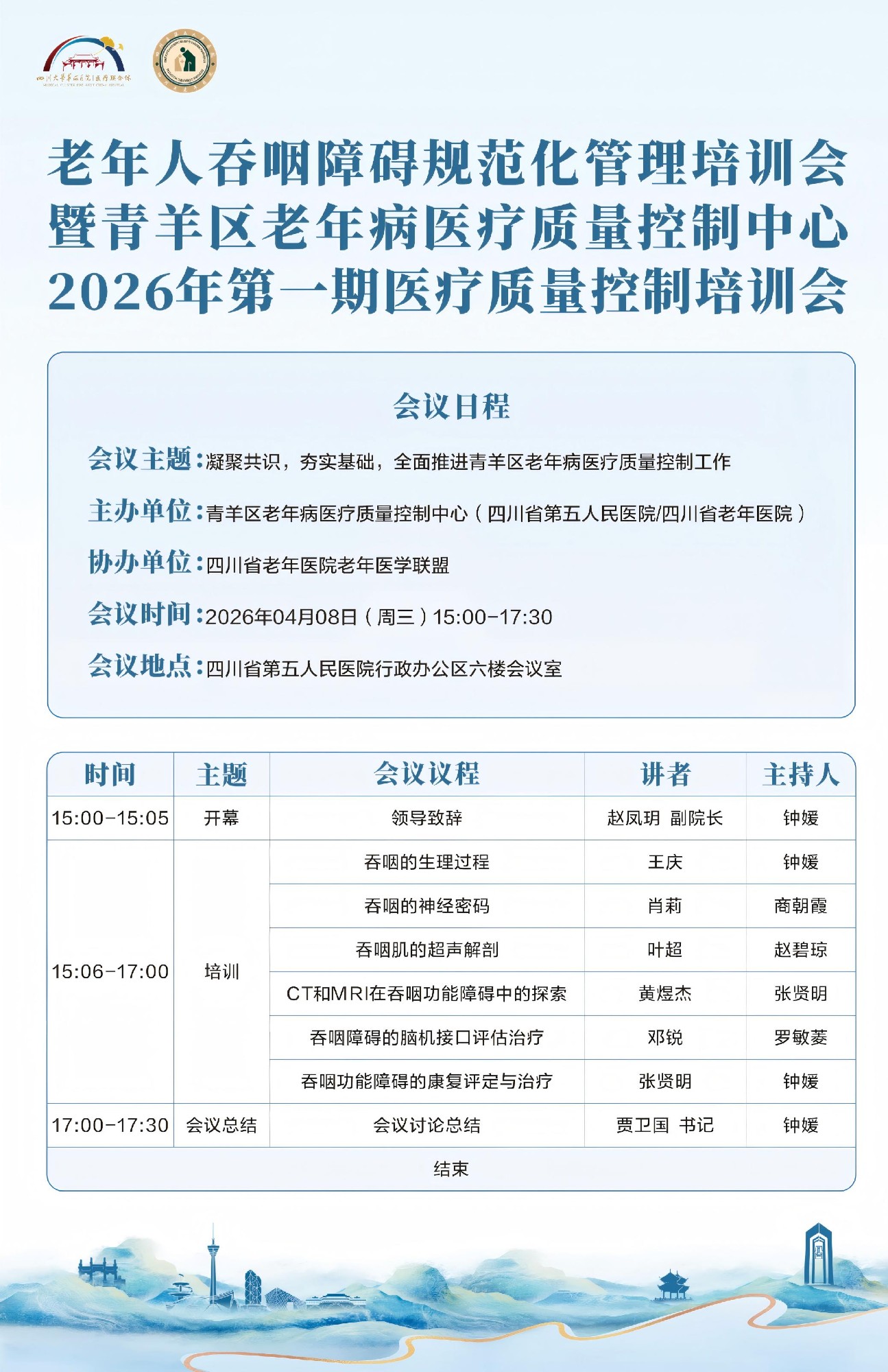 为进一步提升青羊区老年病医疗质量管理水平,推进老年病诊疗标准化、规范化建设,特别是加强老年人吞咽障碍的早期识别与综合管理能力,青羊区老年病医疗质量控制中心(四川省第五人民医院/四川省老年医院)将举办“老年人吞咽障碍规范化管理培训会暨青羊区老年病医疗质量控制中心2026年第一期质控培训会议”。