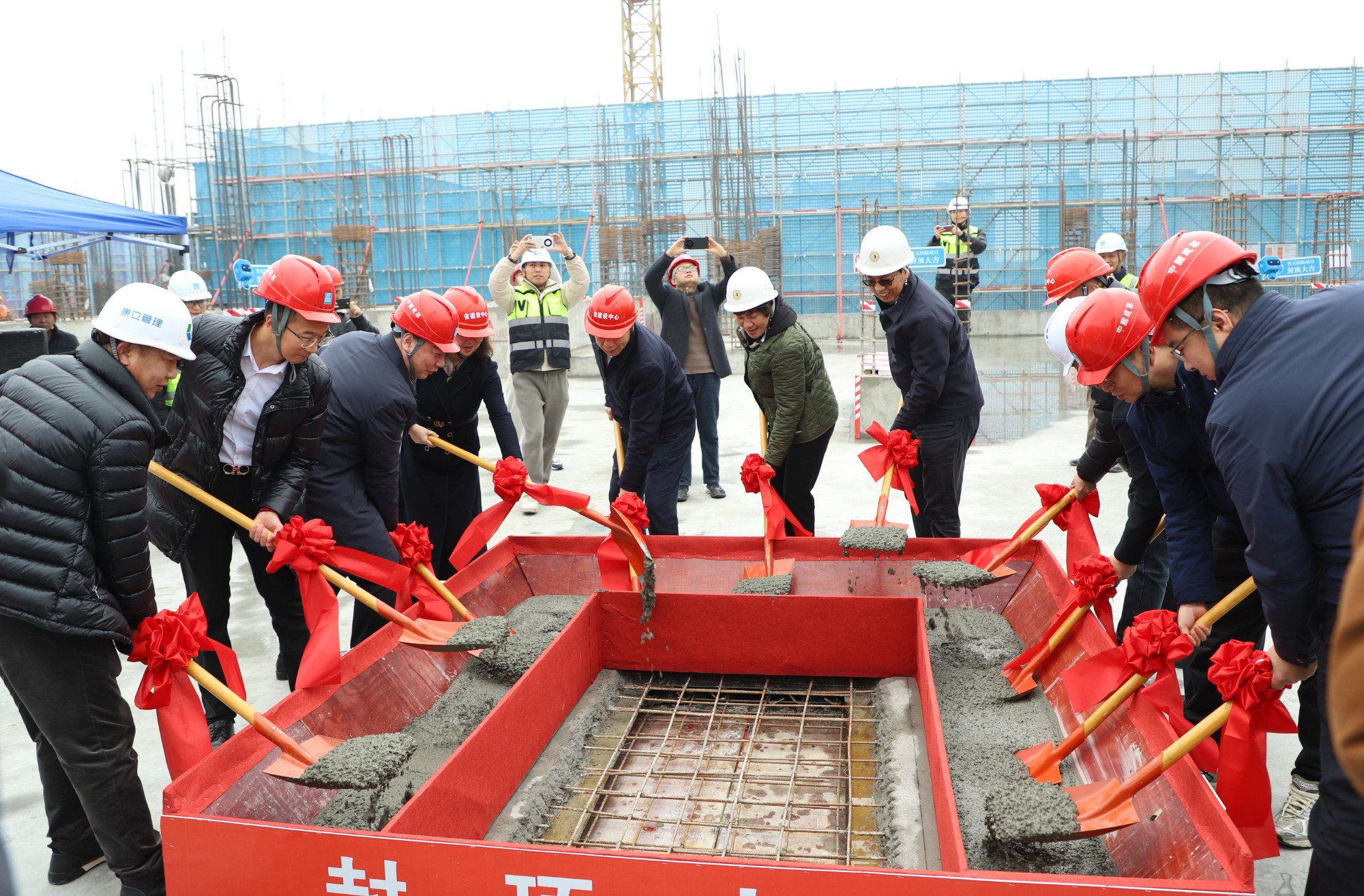 各单位领导共同执锹培土,顺利完成项目一期主体结构最后一块混凝土浇筑。