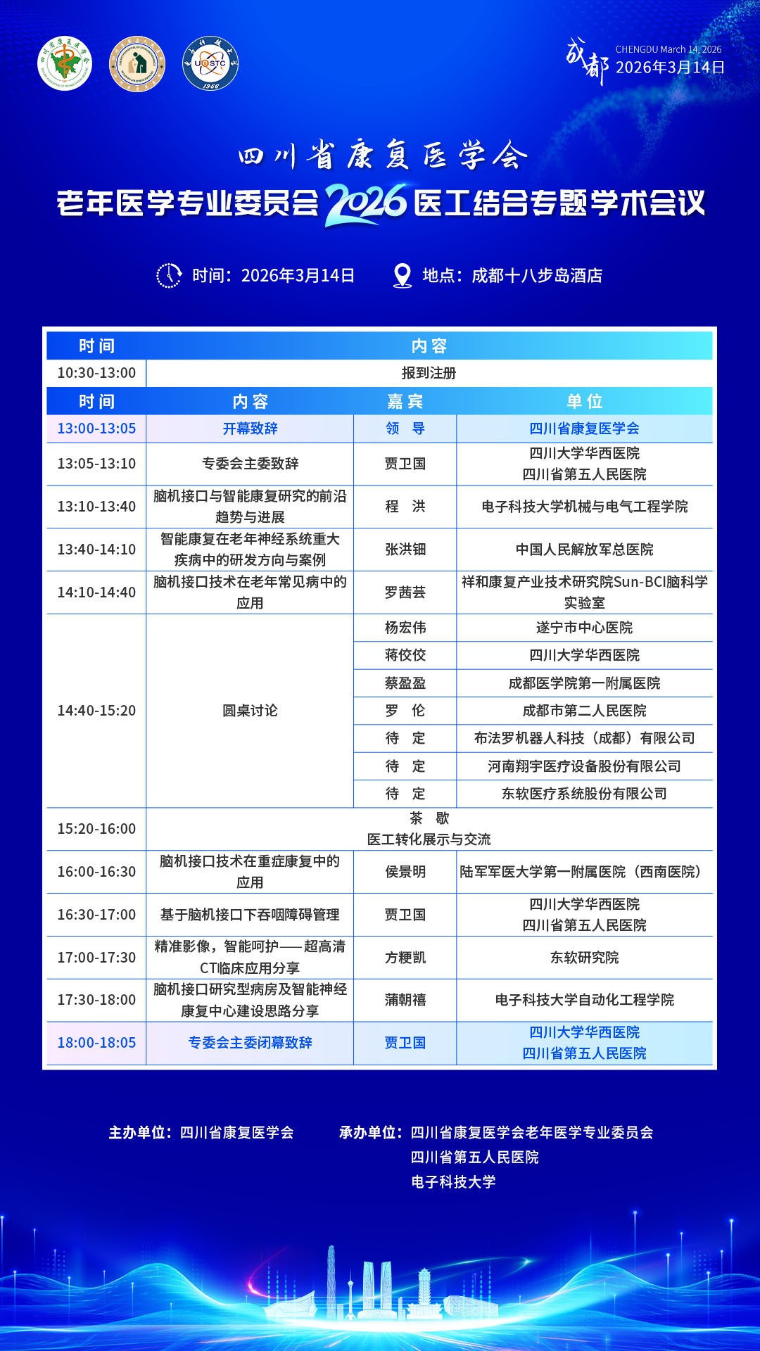 本次会议由四川省康复医学会主办,将于2026年3月14日在成都举行,主题为“神经重塑与智能增强:脑机接口技术与AI机器人协同赋能老年医学新实践”。